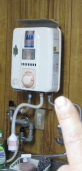 下の写真が、先止め式給湯器、給湯器本体が、湯を出すところと離れたところにあり、離れたところで、水の出し入れの調整するものを先止め式給湯器という。